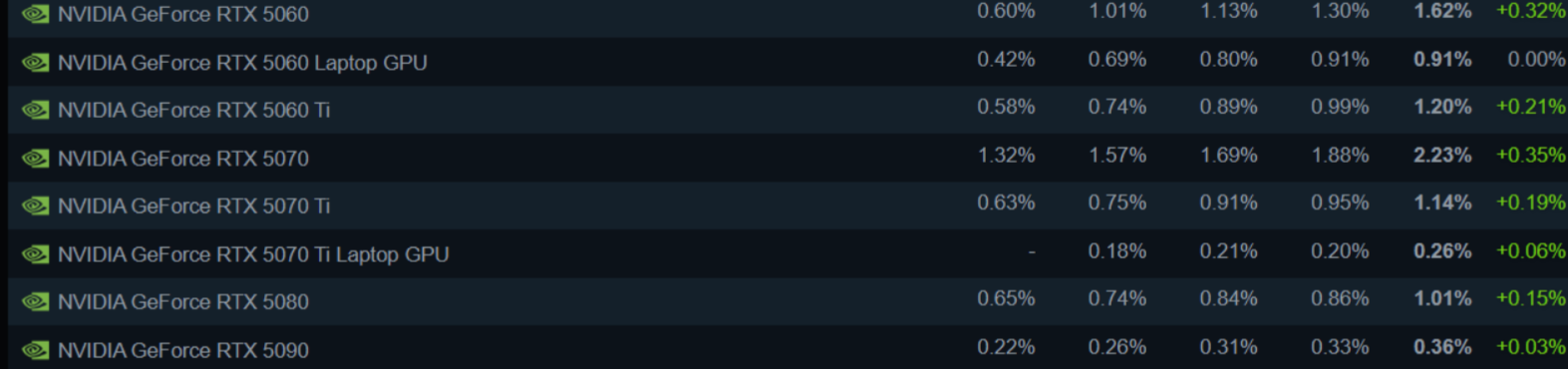 The introduction of NVIDIA’s RTX 50-series graphics cards continues to increase the share of NVIDIA products, with the desktop RTX 5070 representing 2.23% of all users on Steam, ranking it ahead of the RTX 4070 but still just outside of the top ten. Other cards that are part of the Ada-Next lineup, including the RTX 5060, 5060 Ti, and 5070 Ti, are also continuing to show good growth.