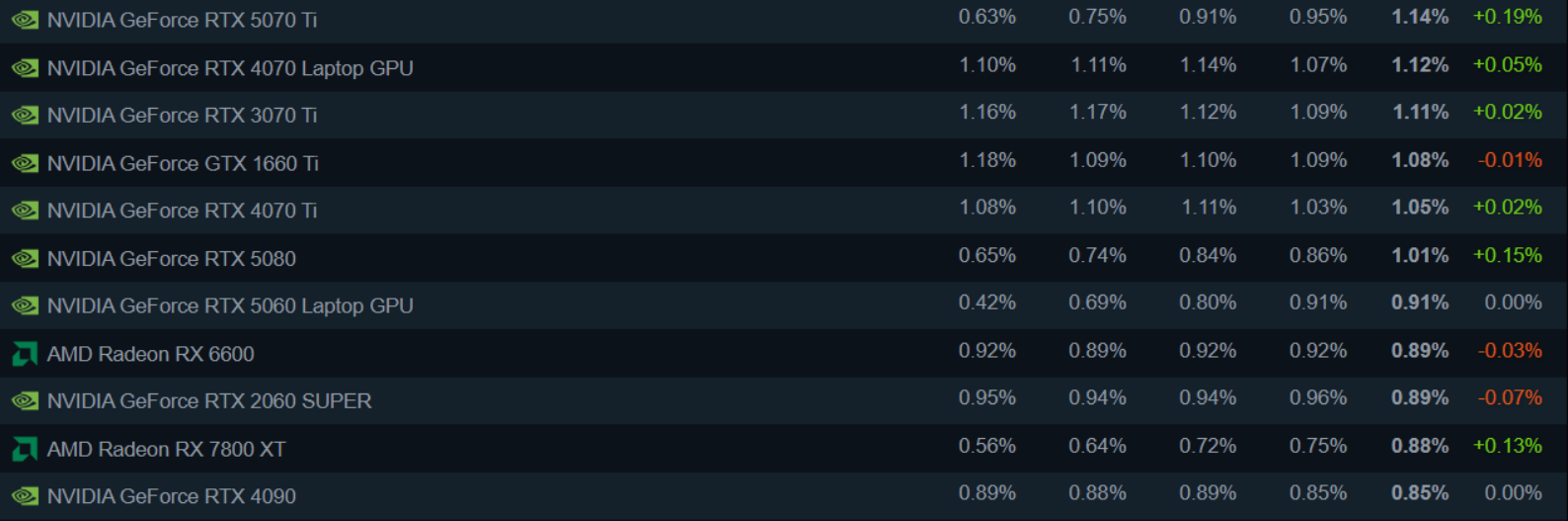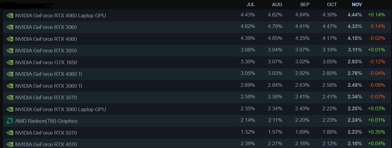 Steam November 2025: Mobile RTX 4060 Leads Again, RTX 5070 Overtakes 4070, Radeon RX 9000 Still Missing from the Charts