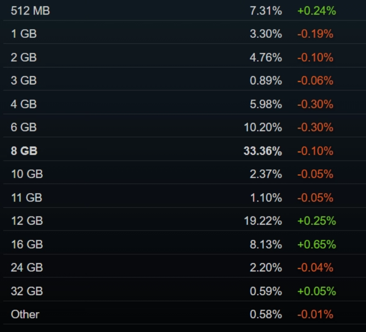 GPUs that have 12GB of VRAM have increased their usage share from 13.76% to 19.22%, while 16GB of VRAM users increased their use from 6.29% to 8.13%, while GPUs that used to utilize 8GB of VRAM still hold the largest share of users, holding over 33.00% of their total shares; but as new hardware continues to be released, their market share decreases very slowly.