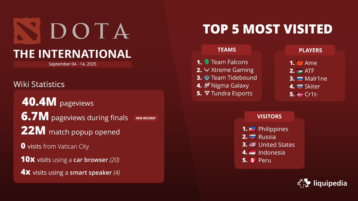 Esports wiki Liquipedia shared an infographic on X featuring statistics from The International 2025.