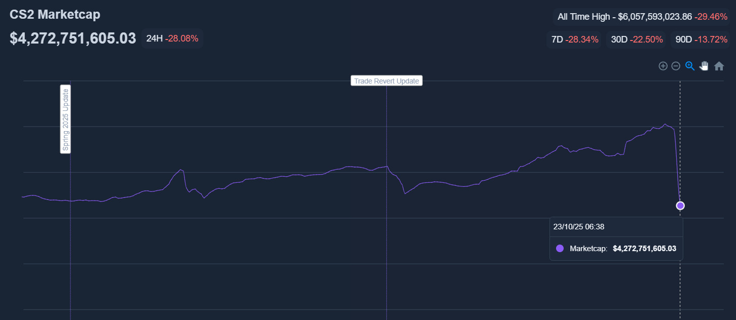 Just two days earlier, on October 21, the CS2 skin market reached a record $6 billion capitalization, continuing a steady rise that had begun in July 2024 — before the sudden downturn reshaped the entire market.